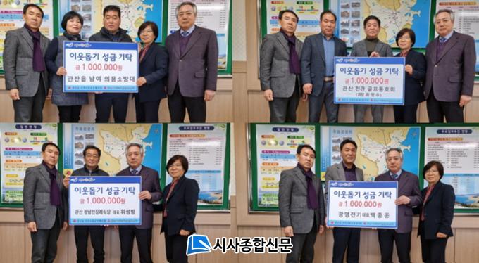 ¶ÇÇÑ, °ü»êÁß 29ȸ µ¿Ã¢È¸(ȸÀå ¹Ú½Â·¡) 50¸¸¿ø, õ°üÀç°¡º¹Áö¼¾ÅÍ(´ëÇ¥ ÀÌÁ¤¹Ì) 30¸¸¿ø, °ü»êÀ¾¿Á´ç2±¸ ÁÖ¹Î(ÀÌÀå À§¼º¼®) 65¸¸¿ø µî »õÇØ dz¼ºÇÑ ³ª´®ÀÌ À̾îÁ³´Ù.