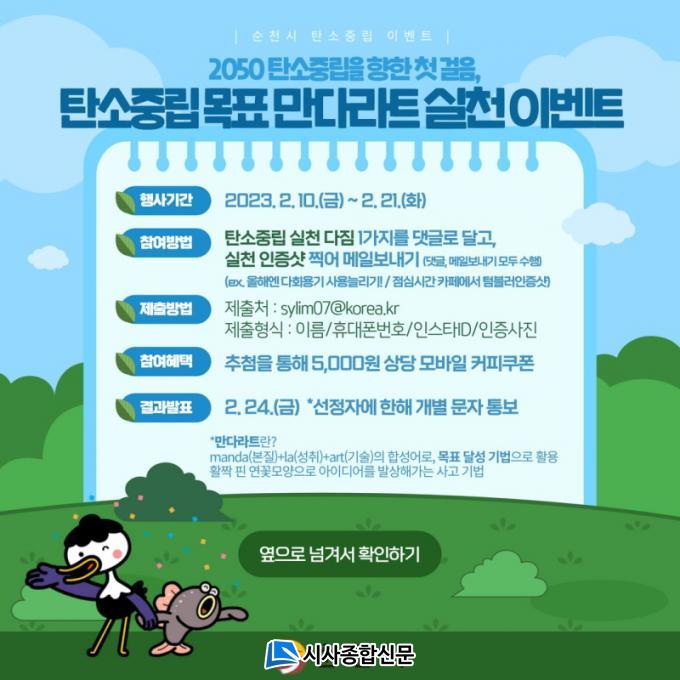 2¿ù¿¡´Â »õÇØ¸ÂÀÌ ¸ñÇ¥ ¼¼¿ì±â¡®Åº¼ÒÁ߸³ ¸ñÇ¥ ½Çõ ÀÎÁõ¡¯À̺¥Æ®¸¦ 10ÀϺÎÅÍ 21ÀϱîÁö ÁøÇàÇÑ´Ù. ¿ÃÇØ ²À ½ÇõÇÏ°í ½ÍÀº ź¼ÒÁ߸³ ¸ñÇ¥ 1°¡Áö¸¦ ´ñ±Û·Î ´Þ°í, ½Çõ ÀÎÁõ»çÁøÀ» Á¦ÃâÇÏ¸é µÈ´Ù. ¼øÃµ½Ã °ø½Ä ÀνºÅ¸±×·¥(@suncheonsi)À¸·Î Âü¿©ÇÒ ¼ö ÀÖÀ¸¸ç, Âü¿©ÀÚ Áß Ãß÷À» ÅëÇØ ¼ÒÁ¤ÀÇ »óǰÀ» Áö±ÞÇÑ´Ù.