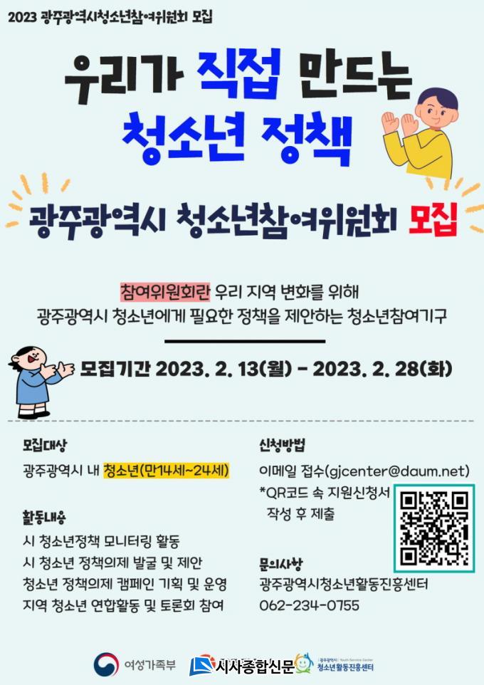 | ±¤ÁÖ½Ãû¼Ò³âȰµ¿ÁøÈï¼¾ÅÍ, 2023³â û¼Ò³âÂü¿©À§¿øÈ¸ À§¿ø ¸ðÁý ¡®Ã»¼Ò³â Á¤Ã¥ ¿ì¸®°¡ Á¦¾ÈÇÑ´Ù!¡¯ |