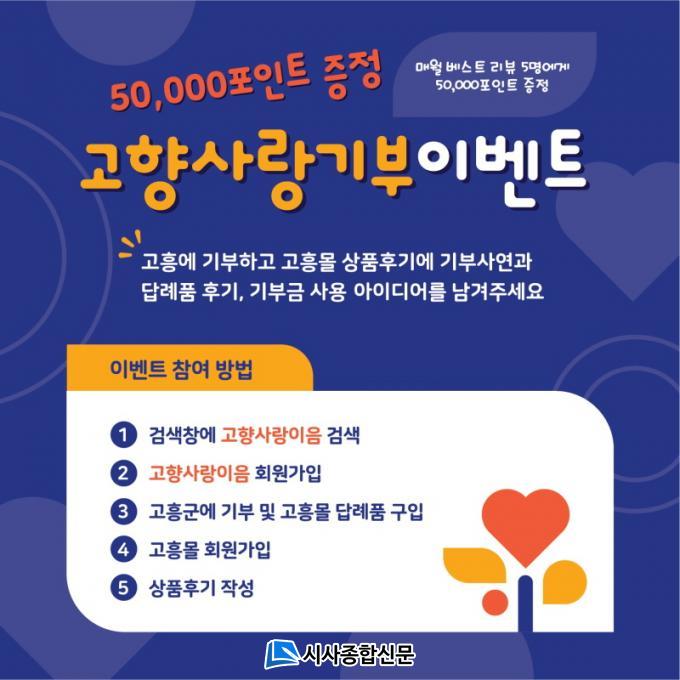 °íÈï¿¡ ±âºÎÇÏ°í ´ä·ÊǰÀ¸·Î °íÈï¸ô ÄíÆùÀ» ¼±ÅÃÇÑ ±âºÎÀÚ¶ó¸é °íÇâ»ç¶û±âºÎÁ¦¿Í °ü·ÃÇÑ ´Ù¾çÇÑ ¾ÆÀ̵ð¾î¸¦ °íÈï¸ô Èı⿡ ÀÛ¼ºÇØ À̺¥Æ®¿¡ Âü¿©ÇÒ ¼ö ÀÖÀ¸¸ç, °íÈﱺÀº ¸Å¿ù º£½ºÆ® ¸®ºä ÀÛ¼ºÀÚ 5¸íÀ» ¼±Á¤ÇØ 1Àδç 5¸¸¿ø »ó´çÀÇ Æ÷ÀÎÆ®¸¦ Áö±ÞÇÒ °èȹÀÌ´Ù.