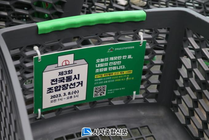 ƯÈ÷, ³óÇù Çϳª·Î¸¶Æ® īƮ¿¡ Á¦3ȸ Àü±¹µ¿½ÃÁ¶ÇÕÀå ¼±°ÅÁ¤º¸°¡ Æ÷ÇԵǾî ÀÖ´Â ±¤°íÆÇÀ» ¼³Ä¡ÇÏ¿© Á¶ÇÕ¿øÀÌ ½±°Ô ¼±°ÅÁ¤º¸¸¦ ¾Ë ¼ö ÀÖµµ·Ï ÇÏ¿´À¸¸ç ¸¶Æ® Á¾ÀÌ ¿µ¼öÁõ¿¡´Â ¼±°ÅÀÏ µî ¼±°ÅÁ¤º¸°¡ ÀμâµÇ¾î Á¶ÇÕ¿ø¿¡°Ô Á¦°øµÈ´Ù.