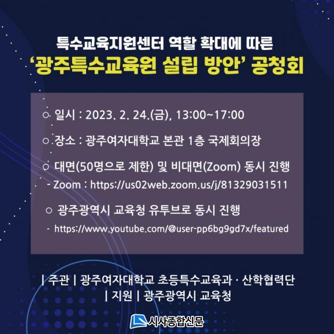 ±¤ÁÖ¿©´ë »êÇÐÇù·Â´Ü(´ÜÀå ¹Úµæ)°ú ÃÊµîÆ¯¼ö±³À°°ú(ÇаúÀå ÀÌÀçÈ£)°¡ ÁÖ°üÇÏ°í ±¤ÁÖ±¤¿ª½Ã±³À°Ã»ÀÌ Áö¿øÇÏ´Â º» °øÃ»È¸´Â ÀÛ³â 10¿ùºÎÅÍ ÁøÇàµÈ ±¤ÁÖÆ¯¼ö±³À°¿ø ¼³¸³ ¹æ¾È¿¬±¸ÀÇ ÇöÀå ÀǰßÀ» ¼ö·ÅÇϱâ À§ÇÑ ÀÚ¸®ÀÌ´Ù.
