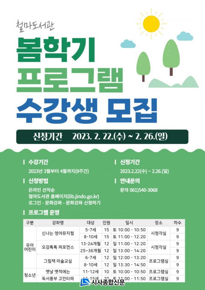 ¿µÀ¯¾Æ¡¤ÃʵîÇлý ÇÁ·Î±×·¥Àº ¡ã½Å³ª´Â ¿µ¾î¹ÂÁöÄà ¡ã¿À°¨ÅåÅå ÆÛÆ÷¸Õ½º ¡ã±×¸²Ã¥ ¹Ì¼ú±³½ÇÀÌ ¿î¿µµÇ¸ç, û¼Ò³âÀº ¡ã¿¾³¯ ¿¾Àû¿¡´Â ¡ãµ¶¼Ç³ºÎ °í¹ÎŸÆÄ µîÀÌ ¿î¿µµÈ´Ù. ÇÁ·Î±×·¥ ½ÅûÀº ¿À´Â 26ÀÏ(ÀÏ) ¿ÀÈÄ 6½Ã±îÁö ÁøµµÃ¶¸¶µµ¼°ü ȨÆäÀÌÁö¿¡¼ ¼±Âø¼øÀ¸·Î ÇÏ¸é µÈ´Ù. ¹®ÀÇ´Â ÁøµµÃ¶¸¶µµ¼°ü(061-540-3068).