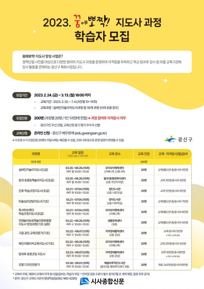 ±¤»ê±¸¹Î ´©±¸³ª Âü¿©ÇÒ ¼ö ÀÖÀ¸¸ç, °úÁ¤º° 20¸í¾¿ ÃÑ 200¸íÀ» ¸ðÁýÇÑ´Ù. ¸ðÁý ±â°£Àº 3¿ù13ÀϱîÁö ¿ÀÈÄ 6½Ã±îÁö´Ù. ±¤»ê±¸ Æò»ýÇнÀÆ÷ÅÐ ¡®¹è¿ì¶û²²¡¯(edu.gwangsan.go.kr)¸¦ ÅëÇØ ¼ö° ½ÅûÀÌ °¡´ÉÇϸç, ÀÚ¼¼ÇÑ »çÇ×Àº ±¤»ê±¸ ±³À°µµ¼°ü°ú(062-960-8285)·Î ¹®ÀÇÇÏ¸é µÈ´Ù.