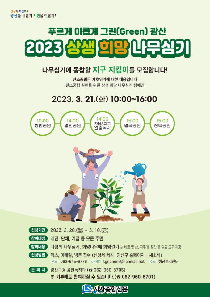 ±× ù ½ÃÀÛÀ¸·Î 21ÀÏ ¡®2023³â »ó»ý‧Èñ¸Á³ª¹« ½É±â Çà»ç¡¯¸¦ ÷´Ü ½Ö¾Ï°ø¿ø, Çϳ²3Áö±¸ ¿ÏÃæ³ìÁö, Àå´ö°ø¿ø µî 5°³¼Ò¿¡¼ ¸±·¹ÀÌ·Î °³ÃÖÇÑ´Ù. Âü¿©¸¦ Èñ¸ÁÇÏ´Â ½Ã¹Î ´©±¸³ª Âü¿©ÇÒ ¼ö ÀÖ´Ù. ½ÅûÀº ±¤»ê±¸ ´©¸®Áý ¡®»õ¼Ò½Ä¡¯¿¡ °Ô½ÃµÈ ½Åû¼¸¦ ÀÛ¼º, °¡±î¿î µ¿ ÇàÁ¤º¹Áö¼¾ÅÍ¿¡ ¹æ¹®ÇØ Á¦ÃâÇϰųª ÆÑ½º(062-945-6776) ¶Ç´Â ÀüÀÚ¿ìÆí(tgnanum@hanmail.net)À¸·Î 14ÀϱîÁö Á¢¼öÇÏ¸é µÈ´Ù.