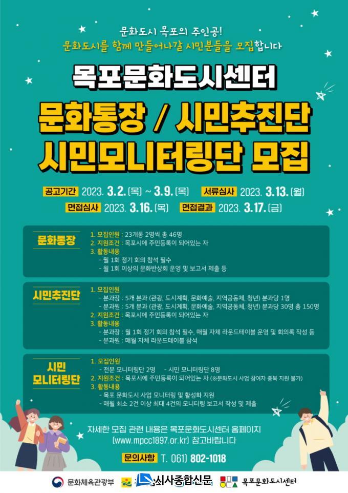 Àü¹®ÀûÀÎ ¸ð´ÏÅ͸µ Ȱµ¿ °æÇè ¶Ç´Â ¹®È±âȹ °æ·ÂÀÌ ÀÖ´Â Àü¹® ¿ä¿ø 2¸í°ú ÀϹݽùΠ¿ä¿ø 8¸íÀ» ¸ðÁýÇÑ´Ù. ÀÚ¼¼ÇÑ »çÇ×Àº ¸ñÆ÷¹®Èµµ½Ã¼¾ÅÍ È¨ÆäÀÌÁö(www.mpcc1897.com)¸¦ Âü°íÇϰųª ÀüÈ(061-802-1017)·Î ¹®ÀÇÇÏ¸é µÈ´Ù.