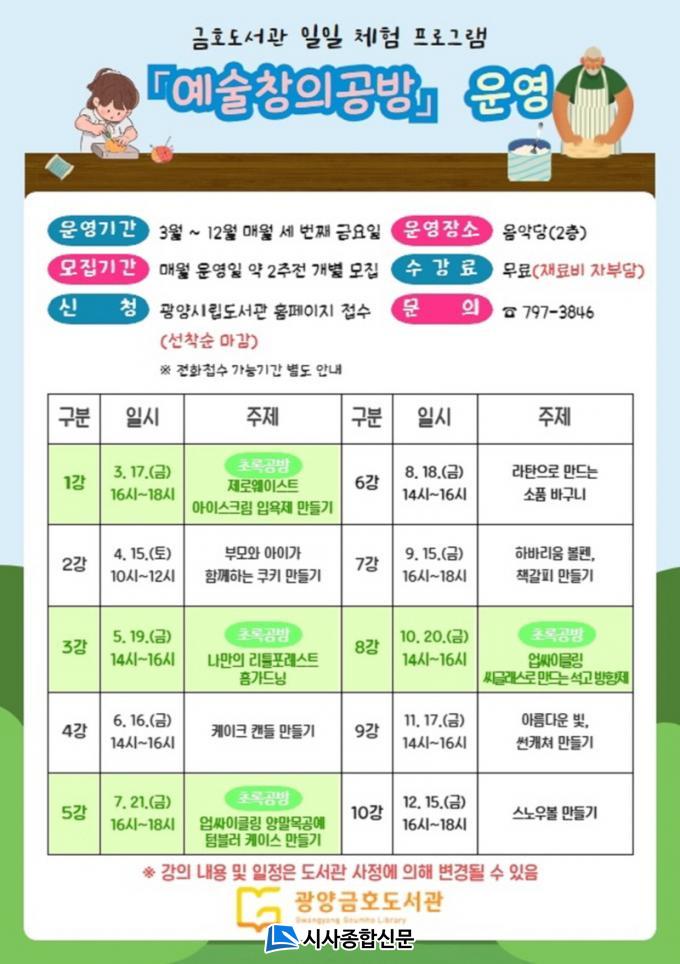 ÀÌ ÇÁ·Î±×·¥Àº ÀÌ¿ë ½Ã¹ÎµéÀÇ ÃëÇâ°ú µµ¼°üÀÇ ÃֽŠƮ·»µå¸¦ ¹Ý¿µÇÑ °¢±â ´Ù¸¥ ÁÖÁ¦·Î ¸Å¿ù ¼¼ ¹øÂ° ±Ý¿äÀÏ¿¡ Á¤±âÀûÀ¸·Î ¿î¿µÇÏ°í ¼ö°»ýÀÇ °ü½É°ú Âü¿©µµ¸¦ ³ôÀ̱â À§ÇØ ÇØ´ç ºÐ¾ßÀÇ Àü¹® °»ç¸¦ ÃʺùÇØ °¿¬À» ÁøÇàÇÒ ¿¹Á¤ÀÌ´Ù. ºÐ±âº° 1ȸ¾¿ ȯ°æ°ú ¿¹¼úÀ» Á¢¸ñÇÑ Ãʷϰø¹æÀ» ÁÖÁ¦·Î ÇÑ °Á ¿î¿µÀ» ÅëÇØ ȯ°æ º¸È£¿¡ ´ëÇÑ ÀνÄÀ» È®»êÇÒ °ÍÀ¸·Î ±â´ëµÈ´Ù.