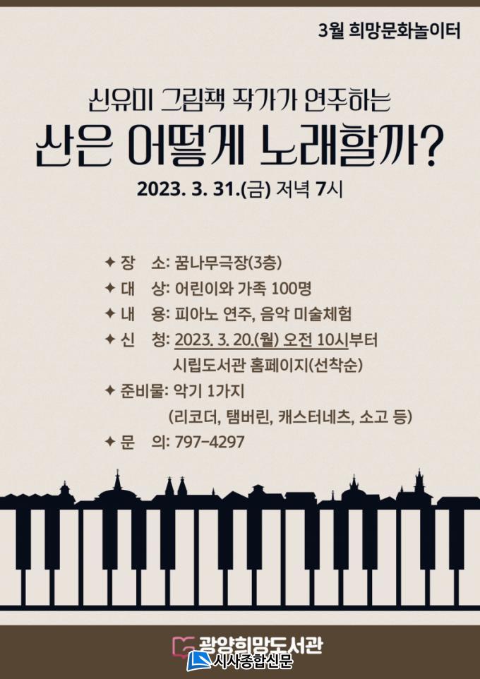 À̹ø °ø¿¬Àº ¸Å¿ù ¹®È°¡ ÀÖ´Â ³¯¿¡ ´Ù¾çÇÑ ¹®ÈÇà»ç¸¦ ÆîÄ¡´Â Èñ¸Áµµ¼°üÀÇ Æ¯º° ÇÁ·Î±×·¥ÀÎ ¡®Èñ¸Á¹®È³îÀÌÅÍ¡¯ÀÇ 3¿ù Çà»ç·Î ±âȹµÆ´Ù. °ø¿¬ÀÚ·Î ³ª¼± ½ÅÀ¯¹Ì ÀÛ°¡´Â ÀÏ·¯½ºÆ®·¹ÀÌÅͷΠȰµ¿Çϸç <³Ê´Â ¼Ò¸®>, <¾Ë¹ÙÆ®·Î½ºÀÇ ²Þ>, <»êÀÇ ³ë·¡> µîÀÇ ±×¸²Ã¥À» Ãâ°£ÇßÀ¸¸ç, º»ÀÎÀÇ ±×¸²Ã¥À» À½¾ÇÀ¸·Î ¸¸µé°í Á÷Á¢ ÇǾƳë·Î ¿¬ÁÖÇÏ¸ç µ¶ÀÚµéÀ» ¸¸³ª°í ÀÖ´Ù.