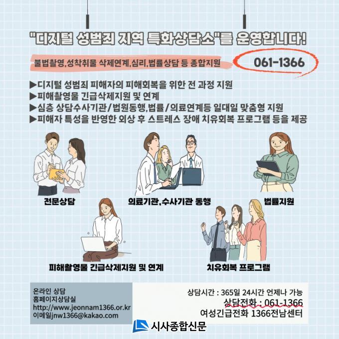 ¡®µðÁöÅÐ ¼º¹üÁË Áö¿ª ƯȻó´ã¼Ò¡¯´Â »ó´ãÀüÈ(061-1366)¸¦ ÅëÇØ 365ÀÏ 24½Ã°£ ¾ðÁ¦³ª Àü¹® »ó´ã»ç¿Í »ó´ãÇÒ ¼ö ÀÖ´Ù. 2021³âºÎÅÍ ¿©¼º°¡Á·ºÎ¿¡¼ ¸Å³â °ø¸ð¸¦ ÅëÇØ Áö¿øÇÏ´Â »ç¾÷À¸·Î Áö³ÇØ ¿©¼º°¡Á·ºÎ ÁÖ°ü ¡®2023³â µðÁöÅÐ ¼º¹üÁË Æ¯ÈÇÁ·Î±×·¥ Áö¿ø °ø¸ð»ç¾÷¡¯¿¡ ¼±Á¤µÅ ¡®¿©¼º±ä±ÞÀüÈ 1366Àü³²¼¾ÅÍ¡¯¿¡¼ ¿î¿µÇÑ´Ù.