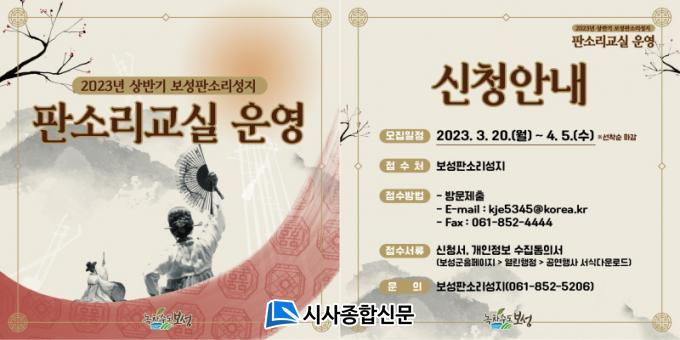 À̹ø ¼Ò¸® ±³½ÇÀº º¸¼º±º¸³±¹¾Ç´Ü ¿¹¼ú °¨µ¶ ¹ÚÃá¸Í ¸íâÀÌ ÁøÇàÇϸç, °í¹ý(¼Ò¸®ºÏ) ±³½ÇÀº ÃʺùµÈ Àü¹®°¡°¡ ±âÃʺÎÅÍ °¡¸£Ä¥ °èȹÀÌ´Ù. °¢ ºÐ¾ß º°·Î 20¿© ¸íÀ» ¼±Âø¼ø ¸ðÁýÇÒ ¿¹Á¤À̸ç, ½ÅûÀº 3¿ù 20ÀϺÎÅÍ 4¿ù 5ÀϱîÁö Á¢¼öÇÑ´Ù. ½Åû ¹æ¹ýÀº º¸¼º±º ȨÆäÀÌÁö ¡æ ¿¸°ÇàÁ¤ ¡æ °ø¿¬/Çà»ç¿¡¼ ¼½ÄÀ» ´Ù¿î·ÎµåÇØ º¸¼ºÆÇ¼Ò¸®¼ºÁö¸¦ ¹æ¹® Á¢¼öÇϰųª ÆÑ½º(061-852-4444) µîÀ¸·Î Âü°¡ ½Åû¼¸¦ Á¦ÃâÇÏ¸é µÈ´Ù.