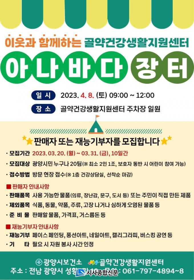 ¾Æ³ª¹Ù´Ù ÀåÅÍ Âü¿©¸¦ ¿øÇÏ´Â ÆÇ¸ÅÀÚ´Â ¿À´Â 3¿ù 31ÀÏ(±Ý)±îÁö °ñ¾à°Ç°»ýȰÁö¿ø¼¾ÅÍ·Î ¹æ¹® Á¢¼öÇÏ¸é µÇ°í, ¼±Âø¼øÀ¸·Î ¸ðÁýÇÑ´Ù.