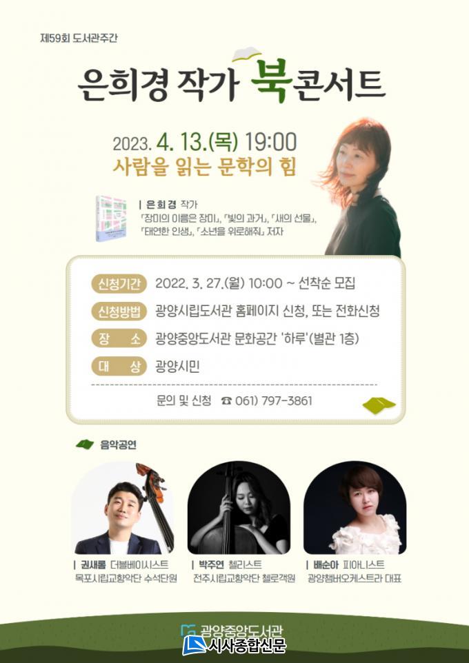 À̹ø Çà»ç´Â ÆòÀÏ ÁÖ°£ µµ¼°ü ÀÌ¿ëÀÌ ¾î·Á¿î ½Ã¹ÎµéÀ» À§ÇØ ¾ß°£¿¡ ÁøÇàÇϸç, Âü¿©¸¦ ¿øÇÏ´Â ½Ã¹ÎÀº 3¿ù 27ÀÏ ¿ÀÀü 10½ÃºÎÅÍ ±¤¾ç½Ã¸³µµ¼°ü µ¶¼¹®ÈÇà»ç ¼ö°½Åû °Ô½ÃÆÇ¿¡¼ ¿Â¶óÀÎ ½Åû ¶Ç´Â ÀüÈ(¢Ï 061-797-3861)·Î ½ÅûÇÏ¸é µÈ´Ù.