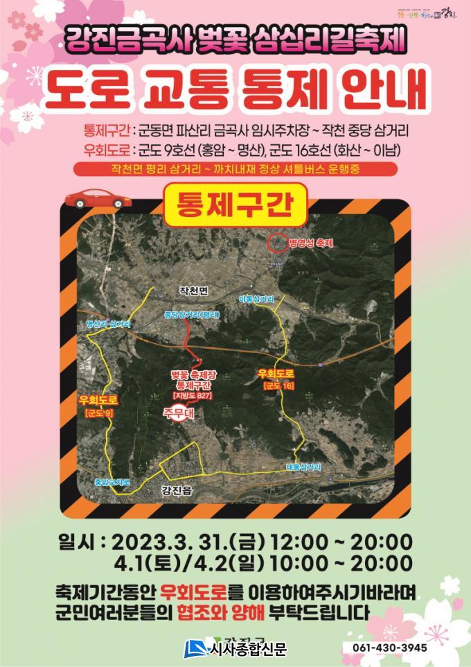 ¾Õ¼ °Áø°æÂû¼ÀÇ ÇùÁ¶¸¦ ÅëÇØ ±îÄ¡³»·Î(Áö¹æµµ 827È£¼±) ±ºµ¿¸é ±Ý°î»ç ÀÏ¿ø¿¡¼ ÀÛõ¸é Áß´ç»ï°Å¸®±îÁö 4.5km ±¸°£ÀÌ ÅëÁ¦µÉ ¿¹Á¤ÀÌ´Ù. 3¿ù 31ÀÏÀº Á¤¿À(12:00)¿¡¼ ¿ÀÈÄ 8½Ã±îÁö, 4¿ù 1Àϰú 2ÀÏÀº ¿ÀÀü 10½Ã¿¡¼ ¿ÀÈÄ 8½Ã±îÁö ÅëÁ¦µÇ¸ç ÅëÁ¦ Á¾·á ½Ã°£Àº ±³Åë»óȲ¿¡ µû¶ó º¯µ¿µÉ ¼ö ÀÖ´Ù.