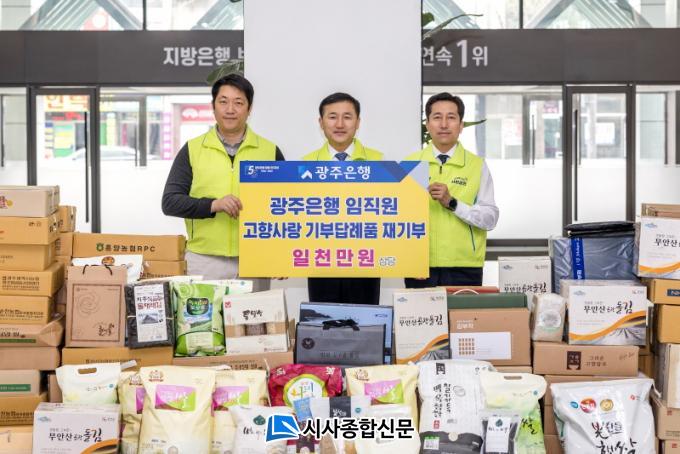 ±¤ÁÖÀºÇà ÀÓÁ÷¿øµéÀº °íÇâ»ç¶û±âºÎÁ¦¿¡ Âü¿©ÇØ ¹ÞÀº ´ä·ÊǰÀ» Áö¿ª »çȸº¹Áö½Ã¼³¿¡ ¶Ç´Ù½Ã ±âºÎÇÏ´Â Çà»ç¸¦ ÆîÃÆÀ¸¸ç, ½Ò¡¤Àâ°î¡¤±è µî 1õ¸¸¿ø »ó´çÀÇ ´Ù¾çÇÑ Ç°¸ñÀÇ ´ä·ÊǰÀ» ±¤ÁÖ±¤¿ª½Ã»çȸº¹ÁöÇùÀÇȸ¿Í ¹®¼öÁ¾ÇÕ»çȸº¹Áö°ü¿¡ Àü´ÞÇß´Ù.