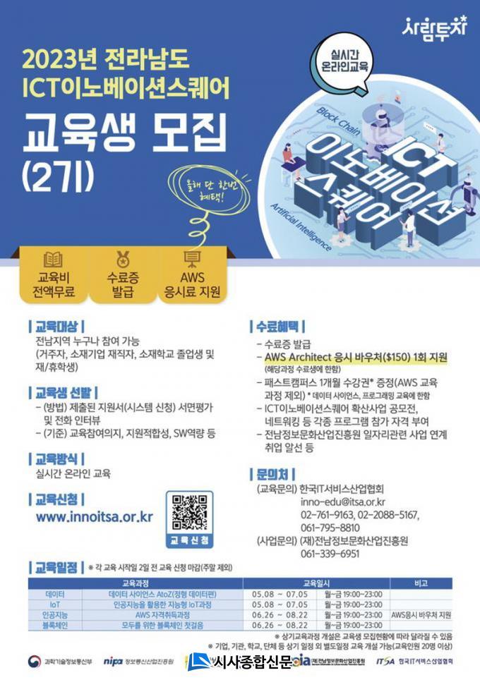 ±³À°ºñ´Â Àü¾× ¹«·áÀ̰í Àü³²µµ¹ÎÀÌ¸é ´©±¸³ª Àü³²ICTÀ̳뺣À̼ǽºÄù¾î ´©¸®Áý(www.innoitsa.or.kr)À» ÅëÇØ ½ÅûÇÒ ¼ö ÀÖ´Ù. ±³À°»ý¿¡°Ô´Â AWS ÀÚ°ÝÃëµæ°úÁ¤ ÀÀ½Ã·á Áö¿ø, ÆÐ½ºÆ®Ä·ÆÛ½º 1°³¿ù ¼ö°±Ç ÁõÁ¤, Ãë¾÷ ¿¬°è µîÀÇ ÇýÅÃÀÌ ÁÖ¾îÁø´Ù.