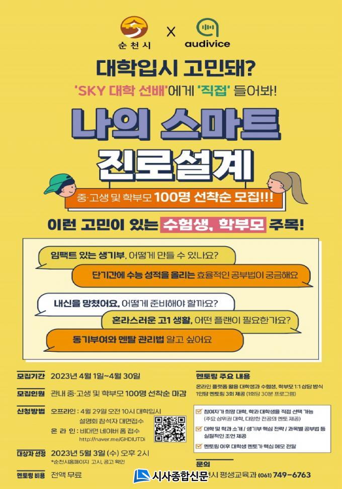 [½Ã»çÁ¾ÇսŹ® = Àå¹Î±Ô ±âÀÚ] ¼øÃµ½Ã(½ÃÀå ³ë°ü±Ô)´Â Áø·Î¡¤ÁøÇÐÀ» °í¹ÎÇÏ´Â Áß¡¤°íµîÇлýµéÀÌ sky Ãâ½Å ´ëÇлý ¸àÅä¿¡°Ô ÀԽà °æÇè°ú °ú¸ñº° °øºÎ¹ýÀ» »ó´ã¹Þ´Â 1:1 ¿Â¶óÀÎ ¸àÅ丵 ¼ºñ½ºÀΡ®¹Ì·¡ÀÎÀç ¾ç¼ºÀ» À§ÇÑ ³ªÀÇ ½º¸¶Æ® Áø·Î¼³°è¡¯ÇÁ·Î±×·¥À» ½Ç½ÃÇÑ´Ù.