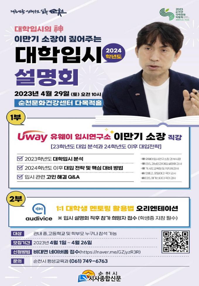 ÇÑÆí, ¼øÃµ½Ã Æò»ý±³À°°ú °ü°èÀÚ´Â ¡°±Þº¯ÇÏ´Â ´ëÇÐÀԽ÷Π°í¹ÎÀÌ ¸¹Àº Çкθð¿Í ÇлýµéÀÌ Ã¼°èÀûÀÎ ´ëÀÔ Àü·«À» ¼ö¸³ÇÏ´Â µ¥ À̹ø ¼³¸íȸ°¡ µµ¿òÀÌ µÇ±æ ¹Ù¶õ´Ù¡±¸ç, ¡°¾ÕÀ¸·Îµµ ±³À°Áö¿ø»ç¾÷ÀÇ ´Ù°¢È¿Í ´Ùº¯È¸¦ ÅëÇØ Áö¿ªÀÇ ¹Ì·¡ÀÎÀç À°¼º¿¡ ÃÖ¼±À» ´ÙÇϰڴ١±¶ó°í ¸»Çß´Ù.