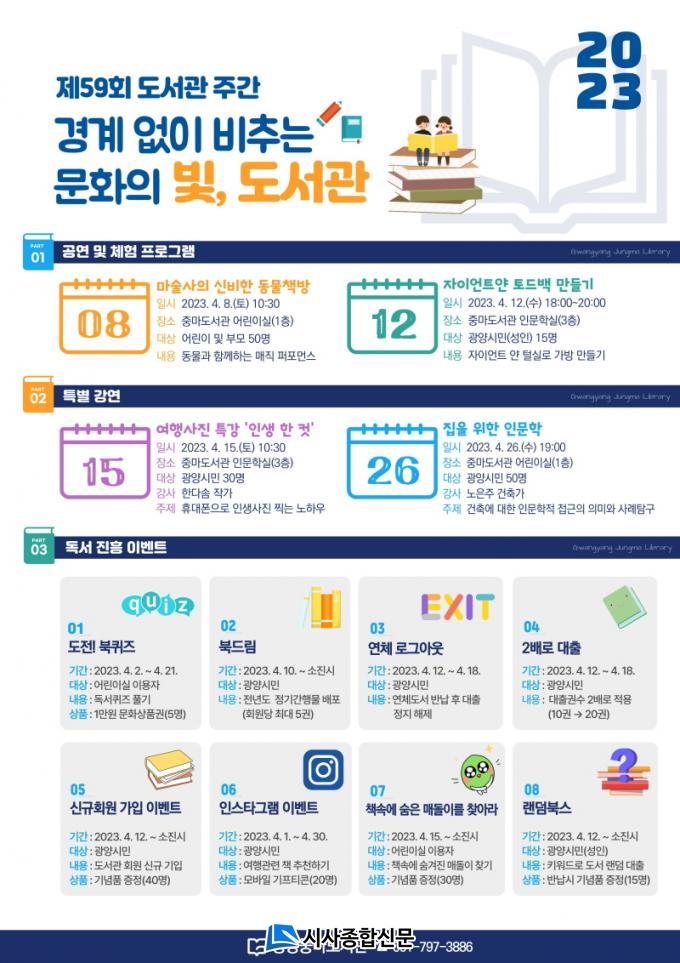 ±×¹Û¿¡ ¡¸¿øÀÛÀÌ ÀÖ´Â ¿µÈ¡¹¸¦ ÁÖÁ¦·Î ¸ÅÁÖ È¿äÀÏ ¿ÀÈÄ 2½Ã ¡ã ¡®ÇϷ硯 ¿µÈ ±ØÀå ¿î¿µ ¡ã¡®µµ¡¤¼¡¤°ü¡¯À¸·Î »ïÇà½Ã Áþ±â ¡ãÀüÀÚÃ¥ µ¶¼¿Õ ¼±¹ß ¡ãµ¶¼ °ø°¨-µ¶¼ÄûÁî ¡ã¡¸4¿ù¿£ Ã¥Àå ¼Ó Ã¥À» ²¨³» Àоî¿ä!¡¹ ÀνºÅ¸±×·¥ À̺¥Æ® ¡ã½Å±Ô ȸ¿ø°¡ÀÔ À̺¥Æ® ¡ãû¼Ò³âÀ» À§ÇÑ ¿øÈ Àü½Ã µî ´Ù¾çÇÑ À̺¥Æ®¸¦ ¿î¿µÇÑ´Ù. ¶ÇÇÑ, ¹«ÇÑÇÑ °¡´É¼ºÀ» °¡Áø »õ·Î¿î ¿¹ºñ ÀÛ°¡¸¦ ¹ß±¼Çϱâ À§ÇØ ±¤¾ç½Ã¹ÎÀ» ´ë»óÀ¸·Î ¿À´Â 28ÀϱîÁö 4¿ù ÇÑ ´Þ°£ ¡®±¤¾ç½Ã âÀ۽à °ø¸ðÀü¡¯À» °³ÃÖÇÑ´Ù.