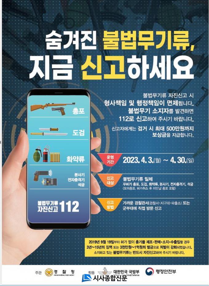 ±×¸®°í ¡°Æ¯È÷, ÃÑÆ÷Ⱦà¹ý¿¡ µû¶ó ºÒ¹ýÀ¸·Î Ãѱ⸦ Á¦Á¶¡¤ÆÇ¸Å¡¤¼ÒÁöÇÒ °æ¿ì 3³â ÀÌ»ó 15³â ÀÌÇÏÀÇ Â¡¿ª ¶Ç´Â 3õ¸¸ ¿ø ÀÌ»ó 1¾ï ¿ø ÀÌÇÏÀÇ ¹ú±ÝÀ¸·Î ó¹ú¹ÞÀ» ¼ö ÀÖÀ¸´Ï, À̹ø ±âȸ¸¦ ³õÄ¡Áö ¸»°í ºüÁü¾øÀÌ ½Å°íÇØ ´Þ¶ó!¡±¶ó°í °Åµì ´çºÎÇß´Ù.