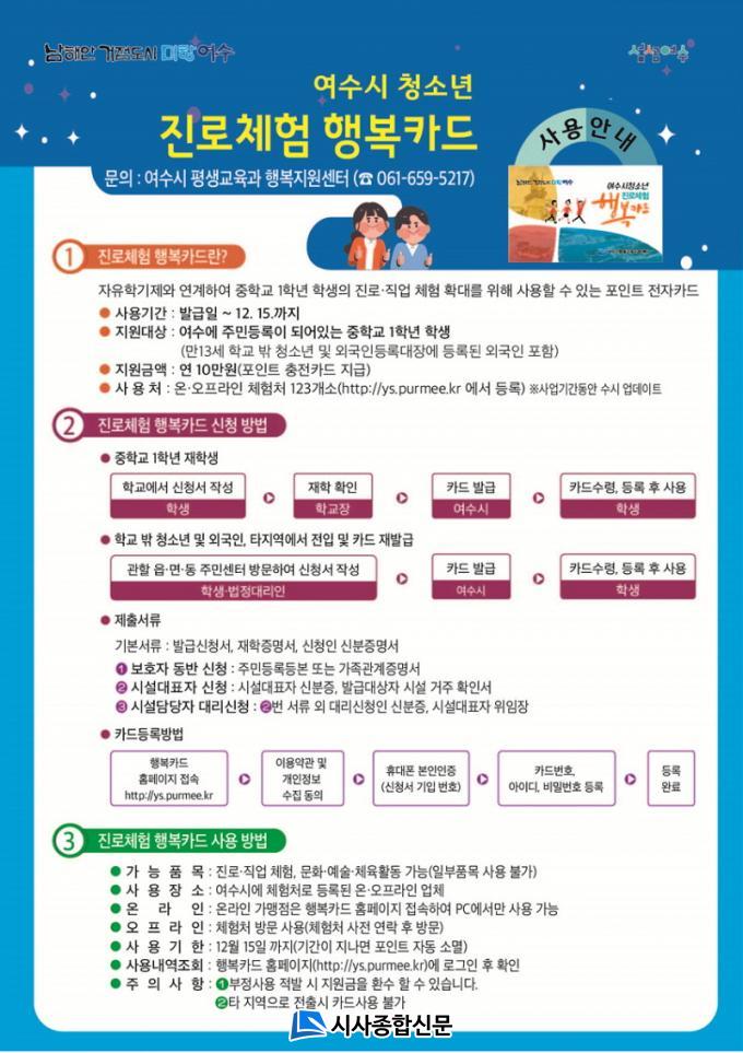 ¡®Áø·ÎüÇè Çູīµå¡¯´Â ÃæÀü½Ä Æ÷ÀÎÆ® Ä«µå·Î ¿¬ 10¸¸ ¿øÀÌ Áö¿øµÇ¸ç, Áø·Î¡¤Á÷¾÷¡¤¹®È üÇè, ¿µÈ¡¤½ºÆ÷Ã÷ °ü¶÷ µî ÁöÁ¤µÈ üÇèó¿¡¼ ÀÚÀ¯·Ó°Ô »ç¿ëÇÒ ¼ö ÀÖ´Ù. Áö¿ø ´ë»óÀº ¿©¼ö½Ã¿¡ °ÅÁÖÇÏ´Â ÁßÇб³ 1Çгâ ÀçÇлý°ú ¸¸ 13¼¼ Çб³ ¹Û û¼Ò³âÀÌ´Ù. ½Ã´Â Áö³ 27ÀϺÎÅÍ 2387¸í¿¡°Ô Çູīµå¸¦ ±³ºÎÇßÀ¸¸ç, ´ë»óÀÚ´Â 12¿ù 15ÀϱîÁö Ä«µå¸¦ »ç¿ëÇÒ ¼ö ÀÖ´Ù. ´Ü, ±â°£ °æ°ú ÈÄ¿¡´Â Æ÷ÀÎÆ®°¡ ÀÚµ¿ ¼Ò¸êµÇ´Ï À¯ÀÇÇØ¾ß ÇÑ´Ù. ÇöÀç µî·ÏµÈ üÇèó´Â 124°³·Î, Çູīµå ȨÆäÀÌÁö(ys.purmee.kr)¿¡¼ È®ÀÎÇÒ ¼ö ÀÖ´Ù.