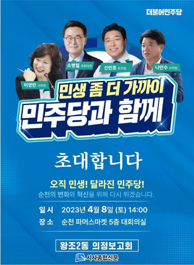 ¼¼ ¹øÂ° º¸°íȸ´Â ½Å¹ÎÈ£ µµÀÇ¿ø°ú ³ª¾È¼ö, ÀÌ¿µ¶õ ½ÃÀÇ¿øÀÇ Áö¿ª±¸ÀÎ ¼øÃµ Á¦6¼±°Å±¸(¿ÕÁ¶2µ¿) ³óÇù ÆÄ¸Ó½º¸¶ÄÏ 5Ãþ¿¡¼ ±× È·ÁÇÑ ¸·ÀÌ ¿¸°´Ù. ¿ÕÁ¶2µ¿Àº ÁÖ·Î ¾ÆÆÄÆ® ¹ÐÁýÁö¿ªÀ¸·Î »ýŵµ½Ã¿¡ °É¸ÂÀº ½Ã¹Î ÈްԽü³°ú ÆíÀǽü³¿¡ °ü½Éµµ°¡ ³ôÀº Áö¿ªÀÌ´Ù.