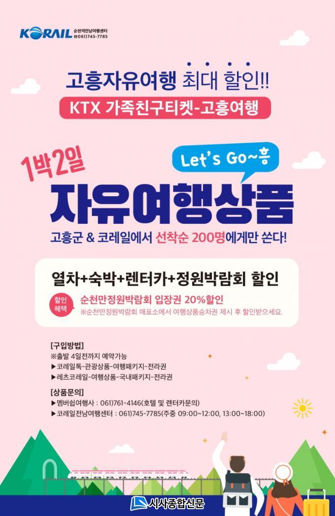 ¡®Let`s Go~Èï 1¹Ú2ÀÏ ÀÚÀ¯¿©Ç࡯ »óǰÀº ¼±Âø¼ø 200¸í¿¡°Ô¸¸ ÆÇ¸ÅµÇ¸ç, °íÈﱺÀÌ 1Àδç 5¸¸¿øÀÇ ¿©Çàºñ¿ëÀ» Áö¿øÇϰí ÄÚ·¹ÀÏ¿¡¼´Â KTX ¿îÀÓ ÇÒÀÎ µîÀ» Áö¿øÇØ ¿Â÷, ¼÷¹Ú, ·»ÅÍÄ«, ¼øÃµ¸¸Á¤¿ø¹Ú¶÷ȸ ÇÒÀÎÀÌ °áÇÕµÈ °íÈï¿©Çà»óǰÀ» ÃÊÆ¯°¡·Î ÀÌ¿ëÇÒ ¼ö ÀÖ´Ù.
