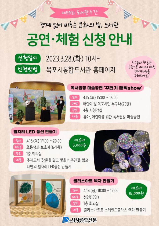 Á¦59ȸ µµ¼°ü ÁÖ°£ Çà»ç¿¡ °üÇÑ ÀÚ¼¼ÇÑ ³»¿ë°ú Âü¿© ½ÅûÀº ¸ñÆ÷ ÅëÇÕµµ¼°ü ´©¸®Áý(www.mokpolib.or.kr)À̳ª °¢ µµ¼°üÀ¸·Î ÀüÈ ¹®ÀÇÇÏ¸é µÈ´Ù.