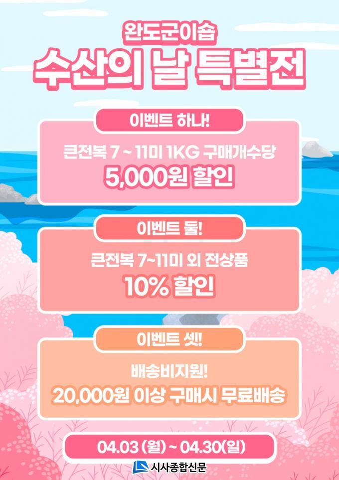 Ưº°Àü´Â 4¿ù 3ÀϺÎÅÍ 4¿ù 30ÀϱîÁö ÁøÇàµÇ¸ç, ¿Ïµµ±º ¿Â¶óÀÎ ¼îÇθôÀÎ ¡®¿Ïµµ±ºÀ̼ó¡¯(www.wandofood.go.kr) ±âȹ°ü¿¡¼ Å« Àüº¹(7~11¹Ì, 1kg)À» ±¸ÀÔ ½Ã °Ç´ç 5000¿ø ÇÒÀÎÄíÆù°ú 20,000¿ø ÀÌ»ó »óǰÀ» ±¸¸ÅÇÏ¸é ¹«·á ¹è¼Û À̺¥Æ®¸¦ ¼±Âø¼øÀ¸·Î ÁøÇàÇÑ´Ù.