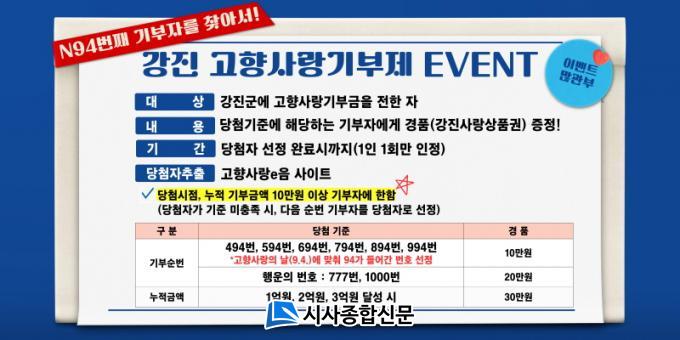 °Áø±ºÀº ¡®94¡¯¼ýÀÚ°¡ µé¾î°£ 494¹ø, 594¹ø, 694¹ø, 794¹ø, 894¹ø, 994¹ø ±âºÎÀÚ¿¡°Ô °Áø»ç¶û»óǰ±Ç 10¸¸ ¿øÀ», Çà¿îÀÇ ¹øÈ£ 777¹ø°ú 1000¹øÂ° ±âºÎÀÚ¿¡°Ô´Â 20¸¸ ¿øÀ», ¸¶Áö¸·À¸·Î ´©Àû ±âºÎ±Ý¾× 1¾ï ¿ø, 2¾ï ¿ø, 3¾ï ¿ø ´Þ¼º ½Ã ¼ø°£ ±âºÎÀÚ¿¡°Ô 30¸¸ ¿øÀ» ÁõÁ¤ÇÑ´Ù.