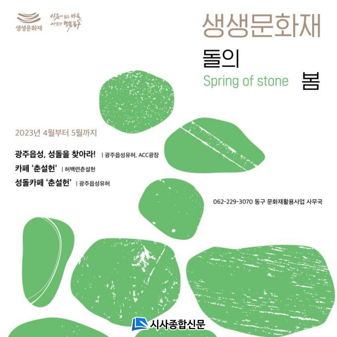 µ¿±¸´Â 7³â ¿¬¼Ó ¹®ÈÀçû ÁÖ°ü ¹®ÈÀç Ȱ¿ë»ç¾÷ÀÌ ¼±Á¤µÊ¿¡ µû¶ó ¡®µ¹ÀÇ º½–spring of stone¡¯À̶ó´Â ÁÖÁ¦·Î »ý»ý¹®ÈÀç °³ÃÖ ±â°£µ¿¾È ¡ãÄ«Æä ¡®Ãá¼³Ç塯 ¡ã±¤ÁÖÀ¾¼º, ¼ºµ¹À» ã¾Æ¶ó! ¡ã¼ºµ¹Ä«Æä ¡®Ãá¼³Ç塯À» ¿î¿µÇÒ ¿¹Á¤ÀÌ´Ù.
