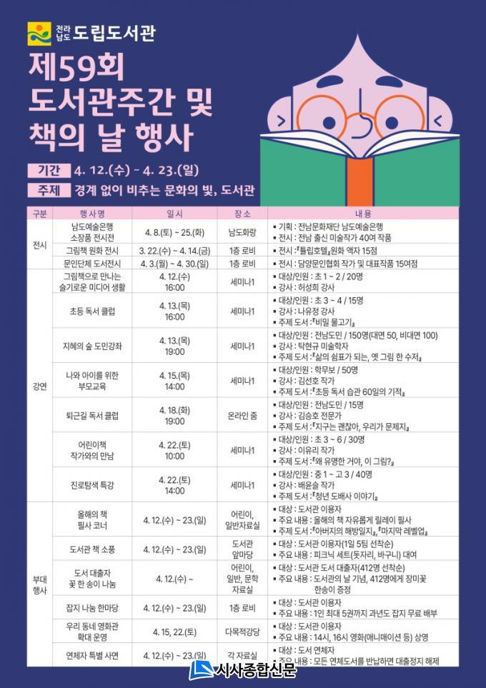 µµ¼°üÁÖ°£ ¹× Ã¥ÀÇ ³¯ Çà»ç¿¡ °üÇÑ ÀÚ¼¼ÇÑ »çÇ×Àº Àü³²µµ¸³µµ¼°ü ´©¸®Áý(https://lib.jeonnam.go.kr)¿¡¼ È®ÀÎÇϰųª ÀüÈ(061-288-5232)·Î ¹®ÀÇÇÏ¸é µÈ´Ù.