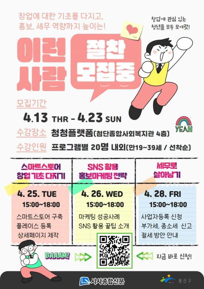 ±¤»ê±¸ ûûÇ÷§ÆûÀÇ Ã»³â Ãë‧â¾÷ Áö¿ø ÇÁ·Î±×·¥ÀÎ ¡®Ã»°í·¡(û³â°ú ÇÔ²² °í¹ÎÇÏ´Â ·¡(³»)ÀÏ)¡¯ÀÇ ÀÏȯÀÌ´Ù. °æ±â ºÎÁø°ú Ãë¾÷³ ¼Ó¿¡¼µµ ¼º°ø â¾÷À» ²Þ²Ù°í Àִ û³âÀÇ Ã¢¾÷¿ª·®À» °ÈÇÏ´Â ´Ù¾çÇÑ ±³À°À» Á¦°øÇÑ´Ù.