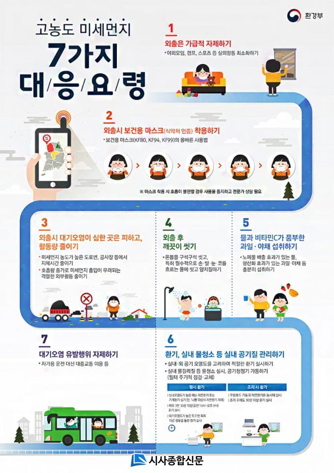 ¶ÇÇÑ °í³óµµ ¹Ì¼¼¸ÕÁö ¹ß»ý ½Ã 7°¡Áö ´ëÀÀ¿ä·ÉÀº ¡ã ¿ÜÃâÀº °¡±ÞÀû ÀÚÁ¦Çϱâ, ¡ã ¿ÜÃâ½Ã º¸°Ç¿ë ¸¶½ºÅ©(½Ä¾àó ÀÎÁõ) Âø¿ëÇϱâ, ¡ã ¿ÜÃâ½Ã ´ë±â¿À¿°ÀÌ ½ÉÇÑ °÷Àº ÇÇÇϰí, Ȱµ¿·® ÁÙÀ̱â, ¡ã ¿ÜÃâ ÈÄ ±ú²ýÀÌ ¾Ä±â, ¡ã ¹°°ú ºñŸ¹ÎC°¡ dzºÎÇÑ °úÀÏ¡¤¾ßä ¼·ÃëÇϱâ, ¡ã ´ë±â¿À¿° À¯¹ßÇàÀ§ ÀÚÁ¦Çϱâ, ¡ã ȯ±â, ½Ç³» ¹°Ã»¼Ò µî ½Ç³» °ø±âÁú °ü¸®ÇϱâÀ̸ç À̸¦ ¼÷ÁöÇÏ°í ½ÇõÇÏ¿©¾ß ÇÑ´Ù.