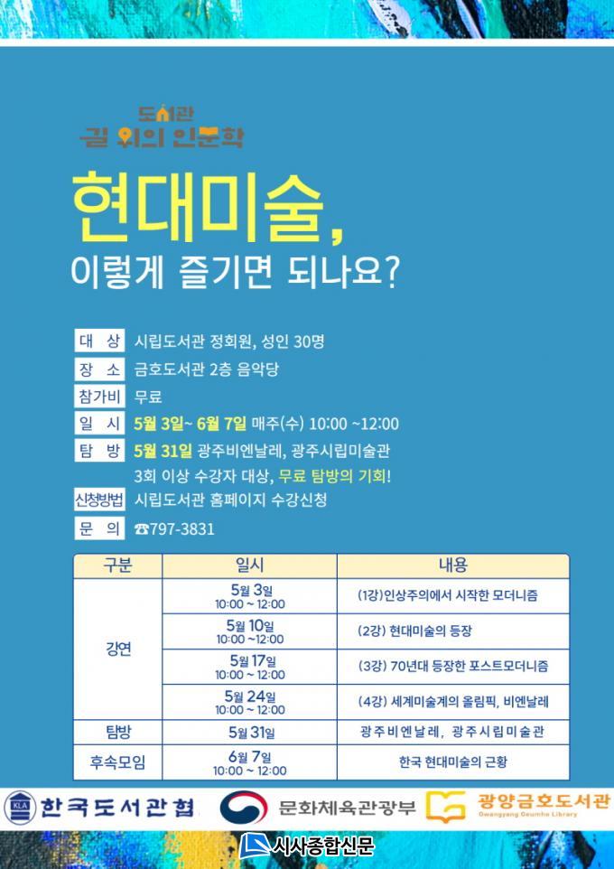 ÇÑÆí, ±æ À§ÀÇ Àι®ÇÐ ¡¸Çö´ë¹Ì¼ú, ÀÌ·¸°Ô Áñ±â¸é µÇ³ª¿ä?¡¹´Â ±¤¾ç½Ã¹Î(¼ºÀÎ)À» ´ë»óÀ¸·Î 4¿ù 17ÀϺÎÅÍ ½Ã¸³µµ¼°ü ´©¸®ÁýÀ» ÅëÇØ ½Åû °¡´ÉÇÏ´Ù. ÀÚ¼¼ÇÑ »çÇ×Àº µµ¼°ü ´©¸®ÁýÀ» ¹æ¹®Çϰųª ±ÝÈ£µµ¼°ü(¢Ï797-3831)À¸·Î ¹®ÀÇÇÏ¸é µÈ´Ù.