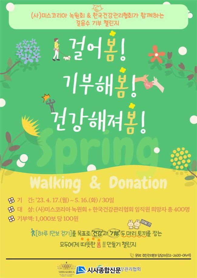º½À» ¸ÂÀÌÇÏ¿© ÁøÇàÇÏ´Â À̹ø Çà»ç´Â °È±â°ú ³ª´®À¸·Î ¡®°Ç°¡¯°ú ¡®±âºÎ¡¯¸¦ µ¿½Ã¿¡ ½ÇõÇÏ´Â 1¼® 2Á¶ÀÇ Ã§¸°Áö´Ù. ¹Ì½ºÄÚ¸®¾Æ ¼ö»óÀÚ·Î ±¸¼ºµÈ ³ì¿øÈ¸ ȸ¿ø°ú °ÇÇù Á÷¿ø Áß Èñ¸ÁÇÏ´Â 400¸íÀÌ Âü¿©Çϸç, ±â°£Àº 4¿ù 17ÀÏ(¿ù)ºÎÅÍ 5¿ù 16ÀÏ(È)±îÁö 30Àϰ£ÀÌ´Ù.