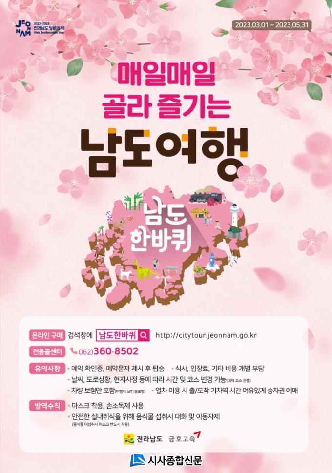 5¿ù 31ÀϱîÁö ¿î¿µÇÏ´Â ¡®³²µµÇѹÙÄû¡¯ º½ Å׸¶»óǰÀº ÀÏ¹Ý ¿©ÇàÄÚ½º·Î ÁÖÁß 15°³, ÁÖ¸» 6°³ ÄÚ½º¸¦ ¿î¿µÇϰí ÀÖÀ¸¸ç ÀüÅë 5ÀÏ ½ÃÀå ÄÚ½º 5°³, Á¦ÁÖ~Àü³² 1¹Ú 2ÀÏ ÄÚ½º 2°³¸¦ ¿î¿µÇϰí ÀÖ´Ù. ƯÈ÷, Àå¾ÖÀΰú °Åµ¿ÀÌ ºÒÆíÇÑ ³ë·ÉÃþÀ» ´ë»óÀ¸·Î ÈÙü¾î ¸®ÇÁÆ® °ü±¤¹ö½º¸¦ ¸Å´Þ 1ȸ, µÑ° ÁÖ ¸ñ¿äÀÏ ¼øÃµ-º¸¼ºÁö¿ª ¹«Àå¾Ö ÄÚ½º·Î ¿îÇàÇØ °ü±¤º¹Áö ÁõÁø¿¡µµ Èû¾²°í ÀÖ´Ù. µ¿ÇàÇÏ´Â º¸È£ÀÚ´Â ¹«·á·Î ž½ÂÇÒ ¼ö ÀÖ´Ù.
