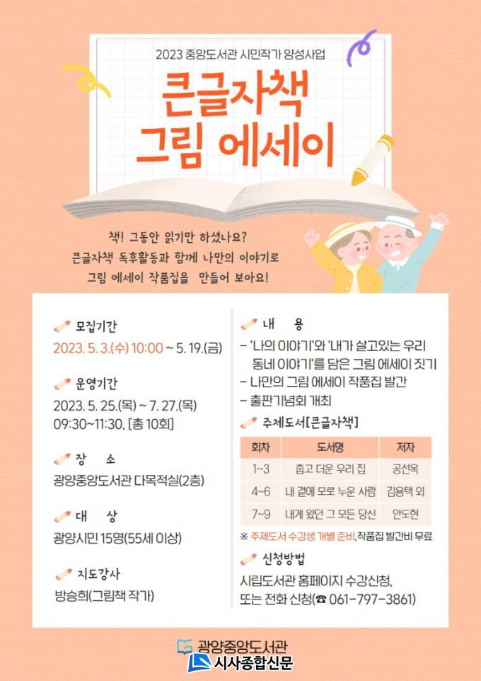 ¡¸Å«±ÛÀÚÃ¥ ±×¸² ¿¡¼¼ÀÌ¡¹´Â µµ¼°üÀ» ±â¹ÝÀ¸·Î ÇÑ ½Ã¹ÎÀÛ°¡ ¾ç¼º ±Û¾²±â ÇÁ·Î±×·¥À¸·Î ½Ã¹ÎµéÀÇ °¨Á¤Ç¥Çö ´É·Â °È¿Í âÀÛÀÇ µÎ·Á¿ò ±Øº¹ µî ³»Àû ¼ºÀåÀ» µµ¸ðÇÏ°í ½Ã¹Î µ¶¼¹®È È®»ê¿¡ ±â¿©ÇϰíÀÚ ÇÏ´Â »ç¾÷ÀÌ´Ù. À̹ø ÇÁ·Î±×·¥Àº 55¼¼ ÀÌ»ó ±¤¾ç½Ã¹ÎÀ» ´ë»óÀ¸·Î 5¿ù 25ÀϺÎÅÍ 7¿ù 27ÀϱîÁö ÃÑ 10ȸÂ÷·Î ¿î¿µÇϸç, Å«±ÛÀÚÃ¥À» Ȱ¿ëÇÑ µ¶ÈÄ È°µ¿°ú ±×¸² ¿¡¼¼ÀÌ Áþ±â °úÁ¤À¸·Î ÀÌ·ïÁø´Ù.