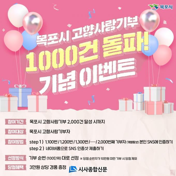 À̹ø¿¡ ÁøÇàµÇ´Â À̺¥Æ®´Â °íÇâ»ç¶û±âºÎ 2,000°Ç Á¶±â´Þ¼ºÀ» ¸ñÇ¥·Î ÁøÇàµÈ´Ù. 1,100¹øÂ° ±âºÎÀÚ¸¦ ½ÃÀÛÀ¸·Î 100´ÜÀ§¾¿ 2,000¹øÂ° ±âºÎÀÚ±îÁö ÃÑ 10¸íÀ» ¼±Á¤ÇØ º»ÀÎ SNS¿¡ ±âºÎ ÀÎÁõ½Ã 3¸¸¿ø »ó´çÀÇ °æÇ°À» Áö±ÞÇÑ´Ù.