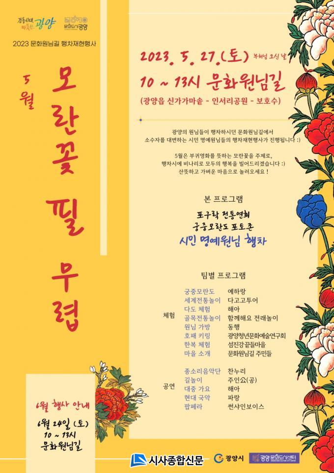 ¡®±¤¾ç ¹®È¿ø´Ô±æ ÇàÂ÷ ÀçÇö¡¯´Â Á¶¼±½Ã´ë ±¤¾çÀ¾¼ºÀÇ ¿ª»çÀû Àå¼Ò¸¦ ±â¹ÝÀ¸·Î ¸¶À»Áֹε鿡°Ô ±¸ÀüµÇ¾î ¿Â ¿ø´Ô ÇàÂ÷¸¦ ½Ã¹ÎµéÀÌ ¹®ÈÀû °üÁ¡¿¡¼ ´Ù¾çÇÑ ¾ÆÀ̵ð¾î¸¦ ¸ð¾Æ Á÷Á¢ ±âȹÇÏ°í ±¸ÇöÇÏ´Â Çà»çÀÌ´Ù.