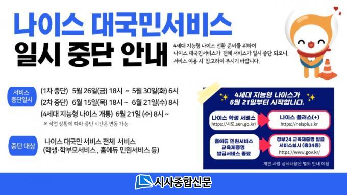 À̹ø ÀϽà Áß´ÜÀº ±³À°ºÎ¿¡¼ ±³À°ÇàÁ¤¾÷¹« È¿À²¼º Çâ»ó ¹× ±³À°°ü·Ã ´ë±¹¹Î¼ºñ½º ÆíÀǼº °È¸¦ À§ÇØ 4¼¼´ë Áö´ÉÇü ³ªÀ̽º ÀüȯÀ» ÁغñÇÏ´Â °³Æí ÀÛ¾÷À» ÇÏ´Â µ¥ µû¸¥ °ÍÀÌ´Ù.