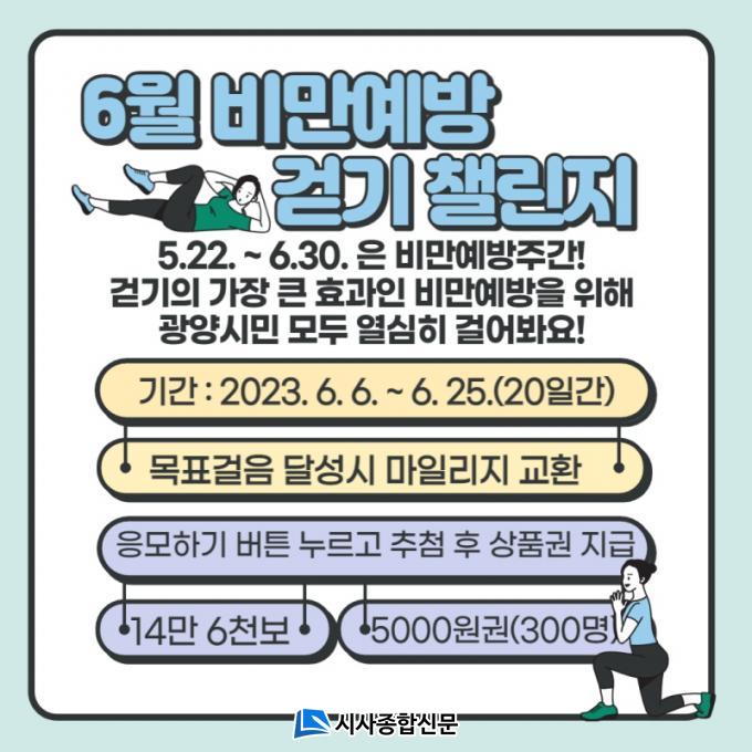 ±¤¾ç½Ã ¼¿µ¿Á °Ç°ÁõÁø°úÀåÀº ¡°ºñ¸¸ ¿¹¹æ ÁÖ°£(5. 22.~6. 30.)À» ¸Â¾Æ ½Ã¹ÎµéÀÇ »ýȰ ¼Ó °È±â¸¦ Àå·ÁÇÔÀ¸·Î½á ºñ¸¸À» ¿¹¹æÇϰí, °Ç°À» Áö۱â À§ÇÑ ²ÙÁØÇÑ °È±â ½À°ü Á¤ÂøÀ¸·Î Áö¿ª»çȸ °Ç°ÇÑ °È±â ¹®È°¡ Á¶¼ºµÇ±æ ¹Ù¶õ´Ù¡±°í ¸»Çß´Ù.