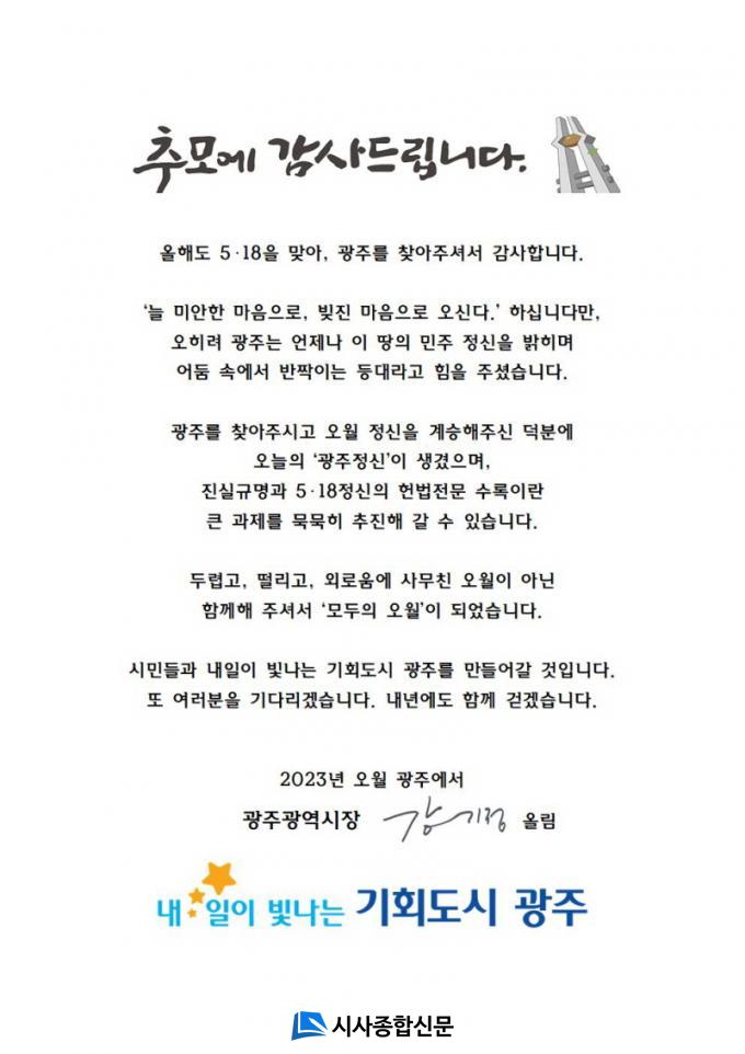 ° ½ÃÀåÀº ¡°¿ÃÇØµµ 5¡¤18À» ¸Â¾Æ ±¤ÁÖ¸¦ ã¾ÆÁÖ°í ÇÔ²²ÇØÁּż °¨»çµå¸°´Ù¡±¸é¼ ¡°¡®´Ã ¹Ì¾ÈÇÑ ¸¶À½À̰í, ºúÁø ¸¶À½ÀÌ´Ù¡¯¶ó°í ÇϽÃÁö¸¸ ¿ÀÈ÷·Á ±¤ÁÖ´Â ¾ðÁ¦³ª ÀÌ ¶¥ÀÇ ¹ÎÁÖ Á¤½ÅÀ» ¹àÈ÷¸ç ¾îµÒ ¼Ó¿¡¼ ¹Ý¦ÀÌ´Â µî´ë¶ó°í ÈûÀ» ÁֽŠ¿©·¯ºÐµéÀÌ Àֱ⿡ ¿Ü·ÓÁö ¾Ê´Ù¡±°í ¸»Çß´Ù.