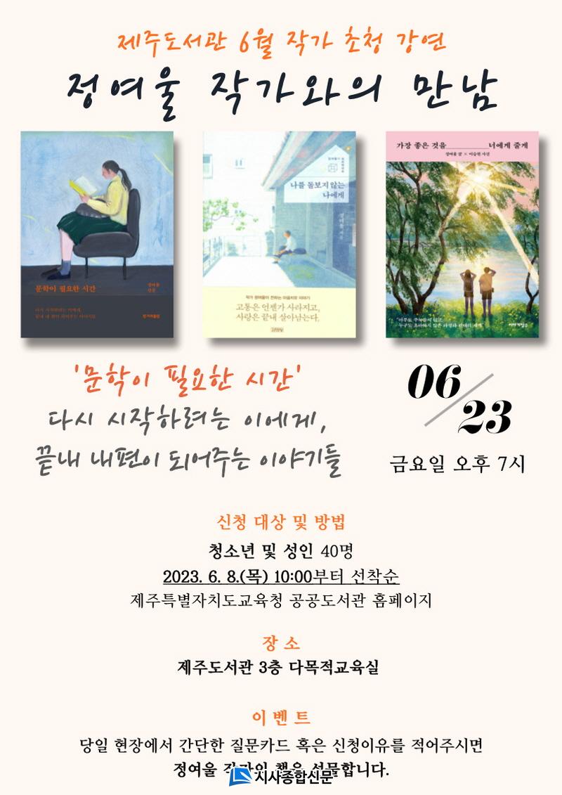 [½Ã»çÁ¾ÇսŹ® = °í¼º¹Î ±âÀÚ] Á¦ÁÖµµ¼°ü(°üÀå ¾çÀ±»ï)Àº 6¿ù 23ÀÏ(±Ý) ¿ÀÈÄ 7½Ã Á¦ÁÖµµ¼°ü 3Ãþ ´Ù¸ñÀû±³À°½Ç¿¡¼ Á¤¿©¿ï ÀÛ°¡ÀÇ Àú¼¡º¹®ÇÐÀÌ ÇÊ¿äÇÑ ½Ã°£¡»À» ÁÖÁ¦·Î ÀÛ°¡¿ÍÀÇ ¸¸³² Çà»ç¸¦ ÁøÇà ÇÒ ¿¹Á¤ÀÌ´Ù.