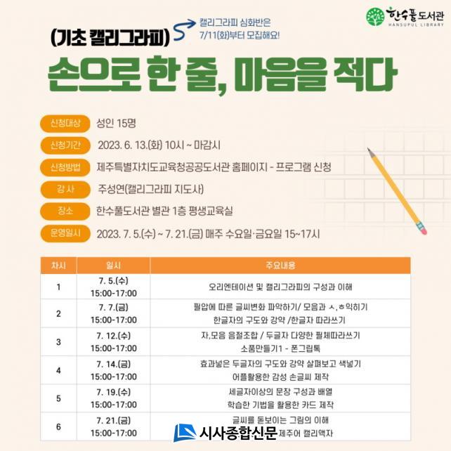 ¡®ÇѼöÇ® ¼öÇÊ Ã¢ÀÛ ±³½Ç¡¯Àº ÇöÅÃÈÆ ÀÛ°¡ÀÇ Áöµµ·Î û¼Ò³â, ¼ºÀÎÀ» ´ë»óÀ¸·Î 2023³â 7¿ù 8ÀϺÎÅÍ 8¿ù 26ÀϱîÁö ¸ÅÁÖ Åä¿äÀÏ 17½ÃºÎÅÍ 19½Ã±îÁö 8Â÷½Ã·Î ¿î¿µµÈ´Ù. ¼öÇÊÀÇ Æ¯¼º°ú ±Û¾²±â ¹æ¹ý¿¡ ´ëÇØ ÇнÀÇϰí Á÷Á¢ âÀÛ ¼öÇÊÀ» ½áº¸´Â ½Ã°£À» °¡Áú ¿¹Á¤ÀÌ´Ù.