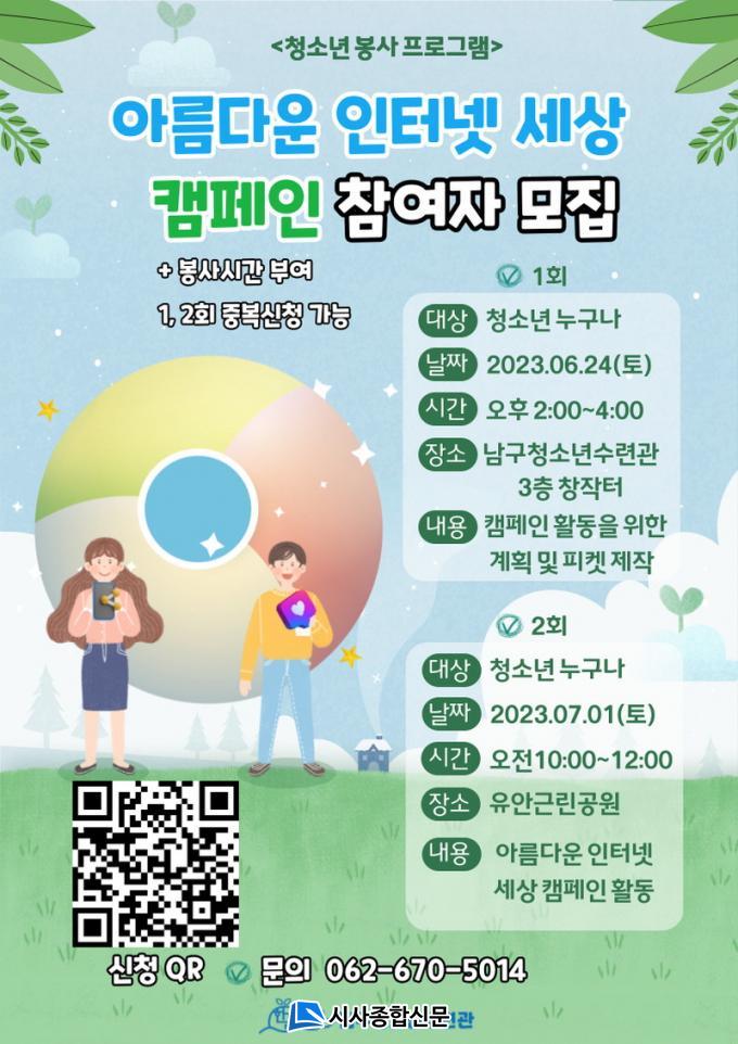 ¡®¿Â¶óÀÎ ¼±Çôޱ⠿¡®°ú ¡¯¾Æ¸§´Ù¿î ÀÎÅÍ³Ý ¼¼»ó¡® Ä·ÆäÀÎÀº û¼Ò³âÀÌ¸é ´©±¸³ª Âü¿© °¡´ÉÇϸç, Âü¿©½ÅûÀº QR ÄÚµå ȤÀº ÀüȽÅûÀÌ °¡´ÉÇÏ´Ù. ±Ã±ÝÇÑ »çÇ×Àº ³²±¸Ã»¼Ò³â¼ö·Ã°ü 062-670-5014·Î ¿¬¶ô¹Ù¶õ´Ù.
