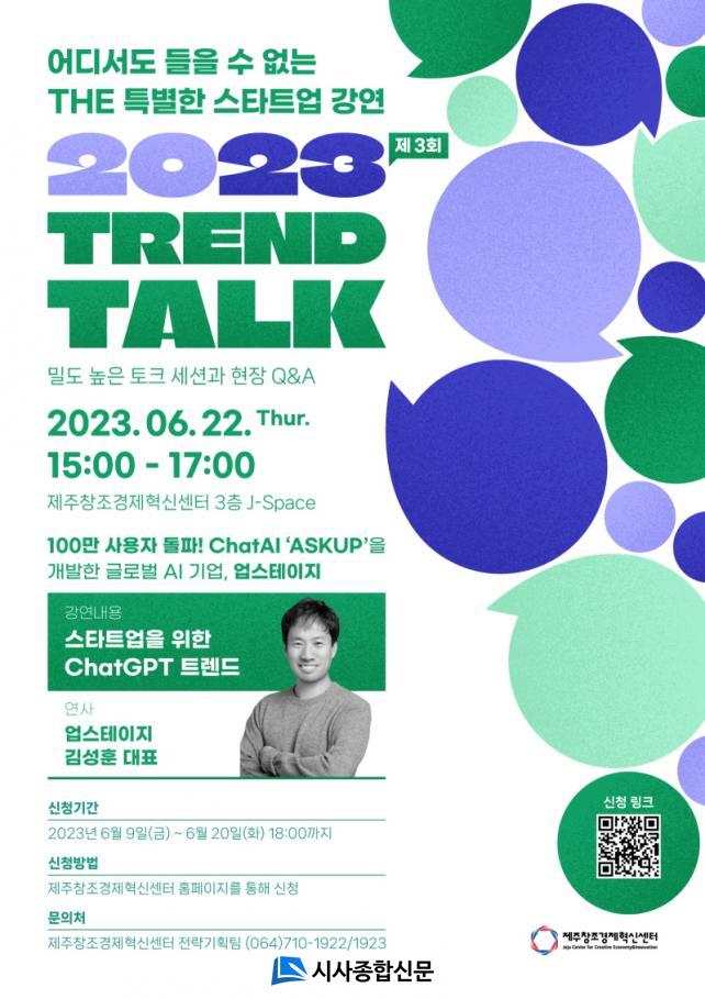 Á¦ÁÖ¼¾ÅÍ´Â À̹ø 3ȸÂ÷ Æ®·»µå ÅäÅ©(Trend Talk)´Â AI Çõ¸í Á߽ɿ¡ Àִ êGPT¸¦ ´Ù·é´Ù. ¾÷½ºÅ×ÀÌÁö ±è¼ºÈÆ ´ëÇ¥°¡ ÁÖ¿ä °¿¬ÀÚ·Î ³ª¼ ¡®Falling in love with ChatGPT¡¯¸¦ ÁÖÁ¦·Î ¿À´Â 22ÀÏ ¿ÀÈÄ 3½ÃºÎÅÍ Á¦ÁÖº¥Ã³¸¶·ç 3Ãþ J-Space¿¡¼ °¿¬À» ÆîÄ¥ ¿¹Á¤ÀÌ´Ù.