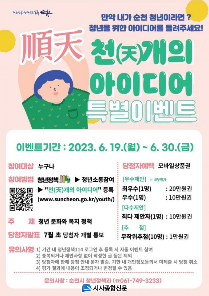 Âü¿©¹æ¹ýÀº Áö³´Þ 1ÀÏ¿¡ ¿ÀÇÂÇÑ ¼øÃµÃ»³âÅëÇÕÇ÷§Æû ¡®Ã»³âÁ¤Ã¥114¡¯ (www.suncheon.go.kr/youth/)ÀÇ ¡®Ãµ(ô¸)°³ÀÇ ¾ÆÀ̵ð¾î¡¯°Ô½ÃÆÇ¿¡ 19ÀϺÎÅÍ 30ÀϱîÁö ¹®È¿Í º¹Áö Á¤Ã¥¿¡ ´ëÇÑ ¾ÆÀ̵ð¾î¸¦ Çü½Ä¿¡ ±¸¾Ö¹ÞÁö ¾Ê°í ÀÚÀ¯·Ó°Ô ÀǰßÀ» µî·ÏÇÏ¸é µÈ´Ù.