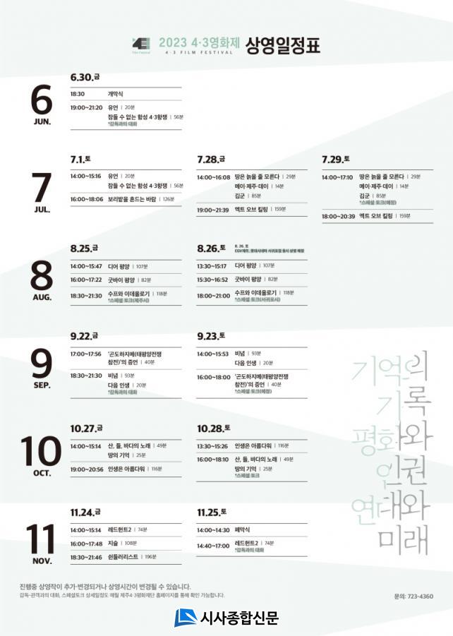Á¦ÁÖ4¡¤3ÆòÈÀç´Ü(ÀÌ»çÀå °íÈñ¹ü, ÀÌÇÏ Àç´Ü)Àº 6¿ù 30ÀÏ(±Ý)ºÎÅÍ 11¿ù 25ÀÏ(Åä)±îÁö ÃÑ 6°³¿ù µ¿¾È <2023 4¡¤3¿µÈÁ¦>¸¦ °³ÃÖÇÑ´Ù.