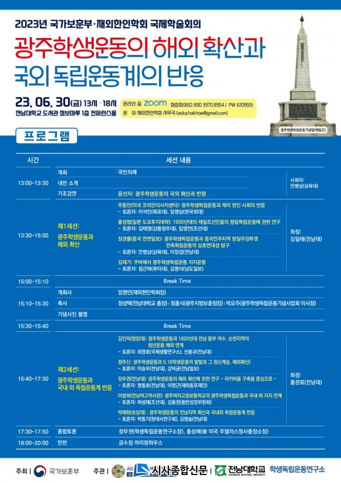 Àü³²´ë Çлýµ¶¸³¿îµ¿¿¬±¸¼Ò(¼ÒÀå Àå¿ì±Ç)°¡ ±¹°¡º¸ÈÆºÎ¿Í Àç¿ÜÇÑÀÎÇÐȸ(ȸÀå ÀÓ¿µ¾ð)¿Í ÇÔ²² ¸¶·ÃÇÑ À̹ø Çмú´ëȸ¿¡¼´Â Àü³²´ë À±¼±ÀÚ ±³¼ö°¡ ¡®±¤ÁÖÇлý¿îµ¿ÀÇ ±¹¿Ü È®»ê°ú ¹ÝÇ⡯À» ÁÖÁ¦·Î Çмú´ëȸ ±âÁ¶°¿¬À» ¸Ã´Â´Ù.