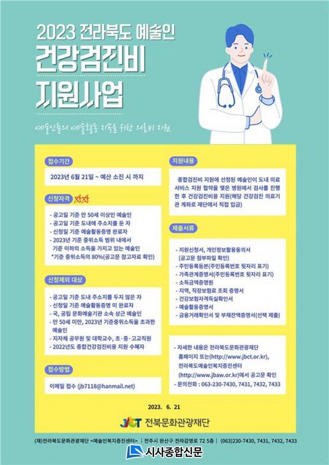 Àü¶óºÏµµ ¿¹¼úÀÎ ÀÇ·áºñ(Á¾Çհǰ°ËÁø) Áö¿ø »ç¾÷Àº ÀÇ·á ¹× °æÁ¦Àû »ç°¢Áö´ë¿¡ ³õ¿© ÀÖ´Â µµ³» ¿¹¼úÀε鿡°Ô ¿¹¼úâÀÛȰµ¿ Áö¼ÓÀ» À§ÇÑ ¾ÈÁ¤ÀûÀΠȯ°æ°ú Á÷¾÷¿ª·® ȸº¹À» µµ¸ðÇϰíÀÚ ¸¶·ÃÇÑ »ç¾÷ÀÌ´Ù.